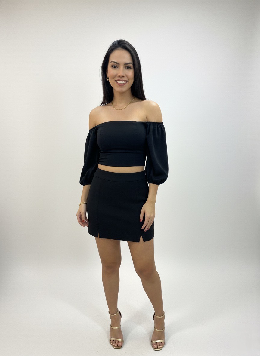 Short saia com fendas frontais e fechamento com zíper nas costas.